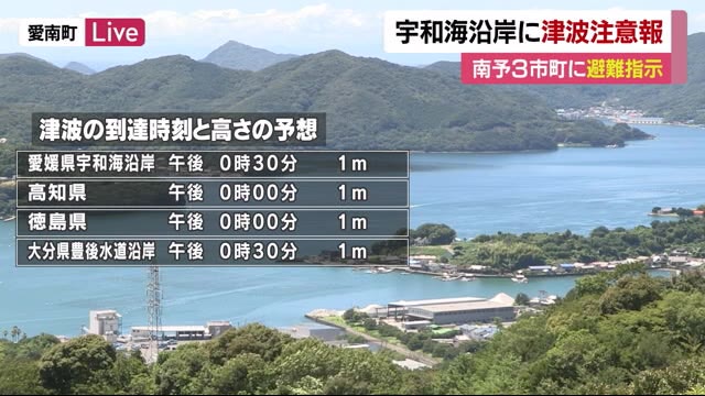 気象庁によりますと、愛媛県内では宇和海沿岸に対し午前9時40分に津波注意報が出され、津波の第1波が午後0時30分に到達すると予想されています。予想される津波の高さは最大で1メートルです。(午後0時25分時点)
