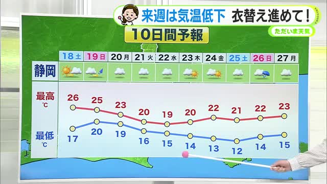 あす18日の朝は気温下がりそうです。静岡17℃、沼津・三島は初めて15℃を下回るかもしれません。昼間は25~26℃できょう金曜ほどではないが気温は高めです。体感の変化に注意してください。日曜日は冷え込みなく、気温の大きな変化はありません。