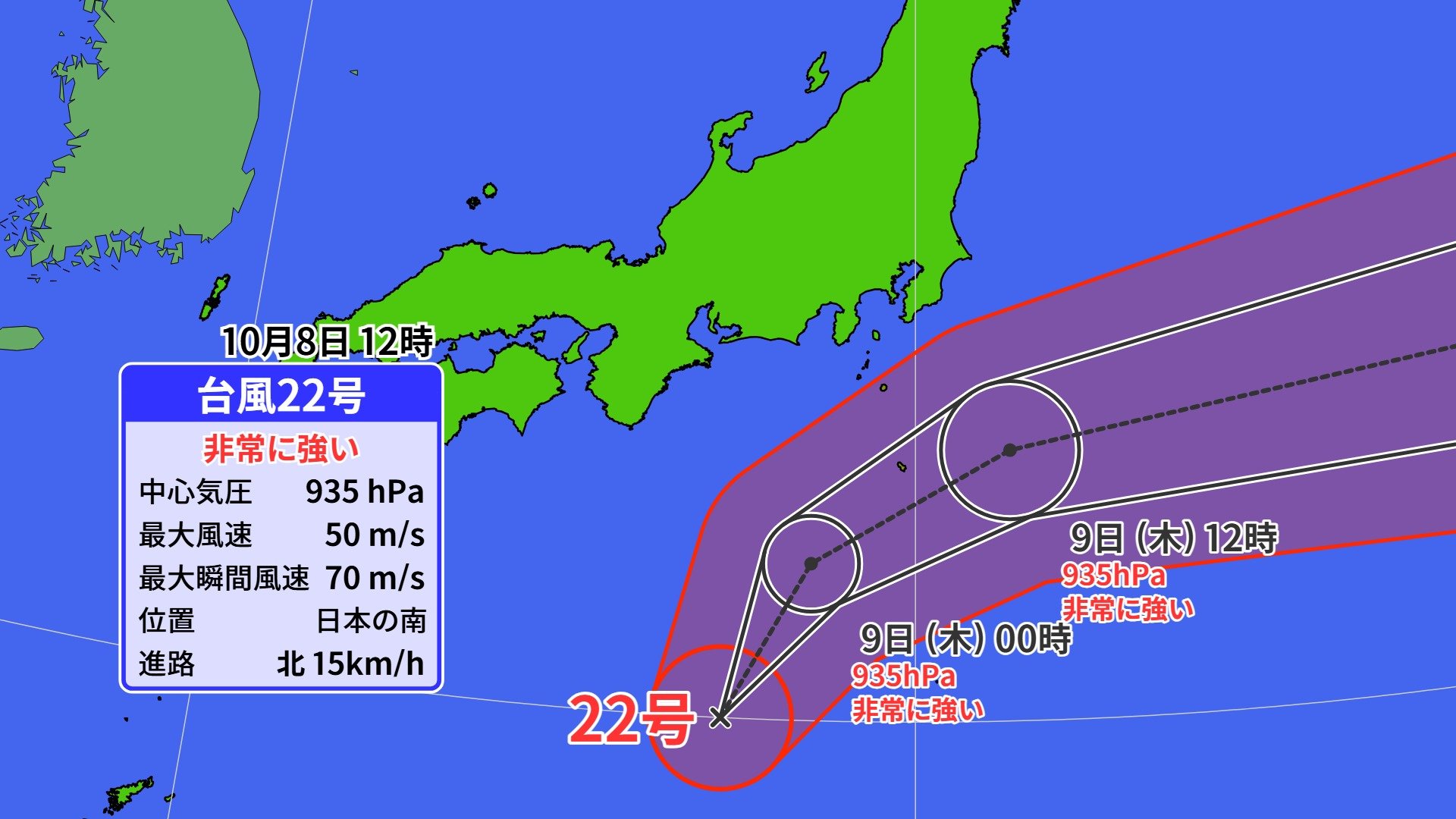 非常に強い台風第22号は、8日午後3時には日本の南にあって、1時間に約20キロの速さで北北東へ進んでいます。中心の気圧は935ヘクトパスカル、中心付近の最大風速は50メートルとなっています。