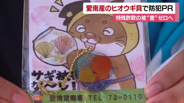 「詐欺被“害”な~し」の願いを込めて愛媛県愛南町では7日、地元の園児や警察官らが、特産のヒオウギ“貝”を使ったグッズと愛南のキャラクター「な~しくん」のイラストを町民らに配り、注意を呼びかけました。