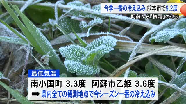 上空の冷たい空気と放射冷却の影響で、28日朝の最低気温は南小国町で3.3度、阿蘇市乙姫で3.6度など県内18ある観測地点全てで今シーズン一番の冷え込みとなりました。